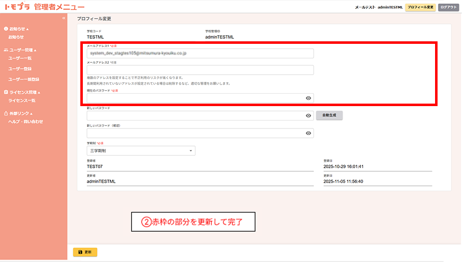 学校管理者のメールアドレスは、以下の手順で変更できます: